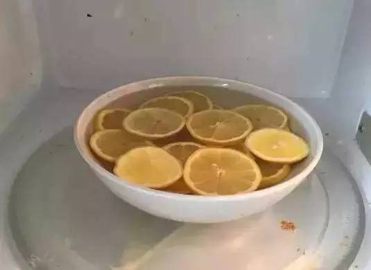 檸檬切片,放入可微波的碗中,加入4~5 湯匙醋,加滿水。將碗放入微波爐內(nèi), 開高火微波5-10分鐘。將碗拿出來后, 用干凈的濕抹布就能輕松擦掉微波爐內(nèi)的油漬啦!