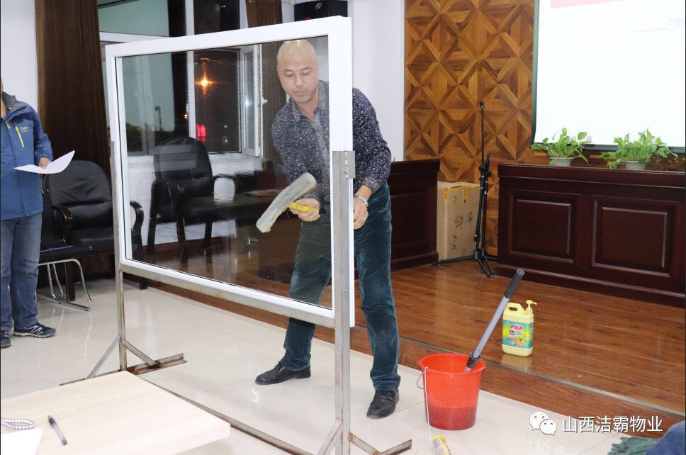 為提高公司管理人員基礎技能,潔霸公司利用周四內(nèi)部員工培訓的時間組織了一次系統(tǒng)的內(nèi)部管理人員檫玻璃培訓,隨后并進行了以組為單位的檫玻璃競賽。