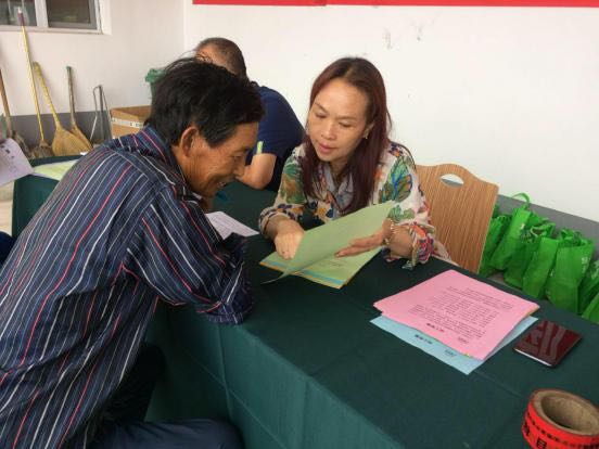 志愿者為農(nóng)村剩余勞動力介紹潔霸公司招工簡章 村民們認(rèn)真閱讀招工簡章。