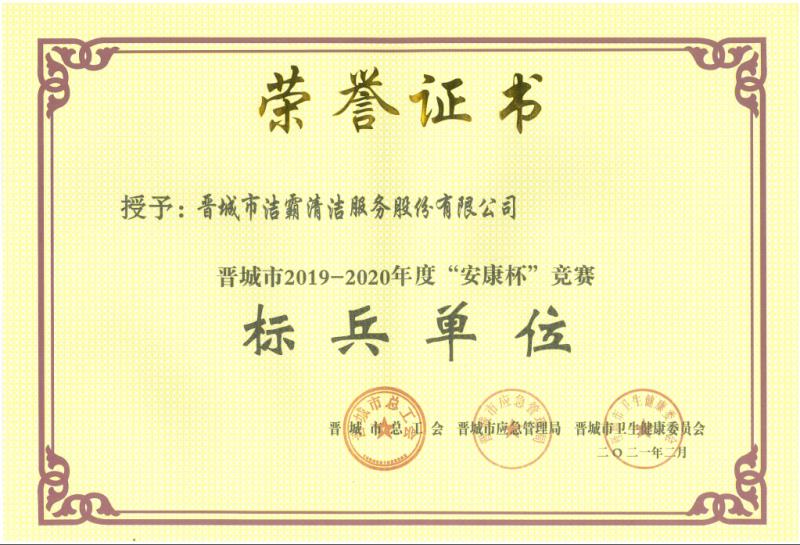日前,在2019----2020年度全市“安康杯”競賽活動中,晉城市潔霸清潔服務股份有限公司被晉城市總工會、晉城市應急管理局、晉城市衛(wèi)生健康委員會聯(lián)合授予“安康杯”競賽“標兵單位”。