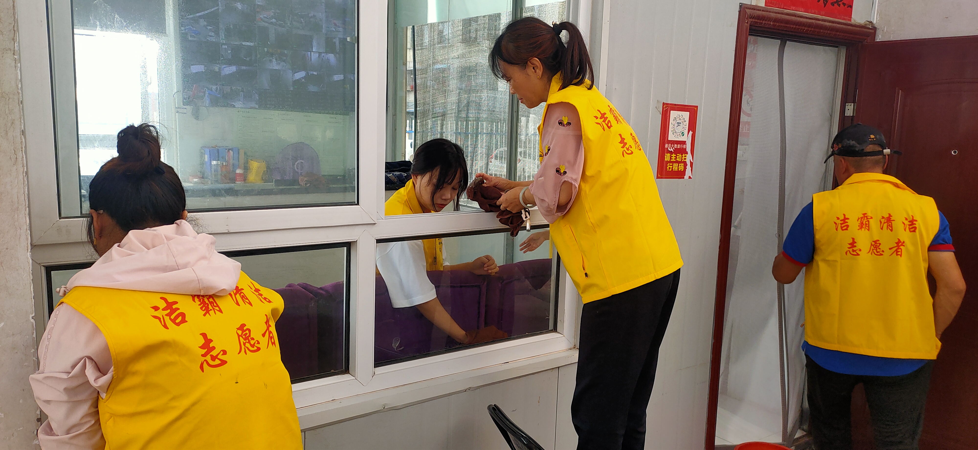 活動(dòng)現(xiàn)場,志愿者身穿黃色馬甲,自帶玻璃擦、毛巾、笤帚、簸箕等清潔工具,對(duì)小區(qū)物業(yè)服務(wù)處及小區(qū)環(huán)境進(jìn)行清潔打掃。他們有的清掃小區(qū)天臺(tái)上的垃圾;有的清理樓道門及公共設(shè)施上的牛皮癬;有的擦拭門衛(wèi)的玻璃;有的清洗紗窗;有的清洗物業(yè)服務(wù)處的玻璃幕墻……志愿者個(gè)個(gè)干勁十足,不怕臟、不怕累,經(jīng)過一個(gè)多小時(shí)的團(tuán)結(jié)協(xié)作,小區(qū)環(huán)境煥然一新。