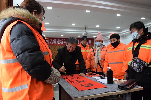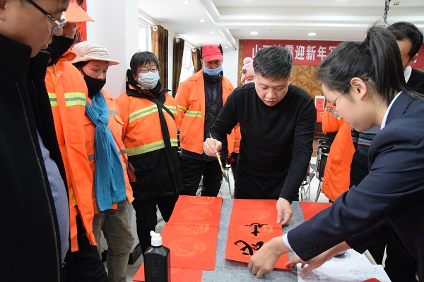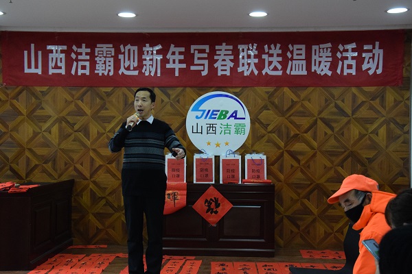 現(xiàn)場人頭攢動,熱鬧非凡,處處洋溢著歡樂喜慶的氣氛。賈大一老師剛執(zhí)墨筆,就吸引了現(xiàn)場數(shù)十名員工駐足觀賞。他的書法如行云流水,一副寓意著對新年美好祝福的春聯(lián)便一氣呵成。各位老師揮毫潑墨,一幅幅散發(fā)著清新墨香的春聯(lián)展現(xiàn)在大家面前!懊坊í劇鲍@得者張保平老師現(xiàn)場演唱上黨梆子戲曲名段,字正腔圓,渾厚豪邁,把活動推向了高潮。市總工會副主席韓敦峰為員工分發(fā)了對聯(lián)和防疫口罩。