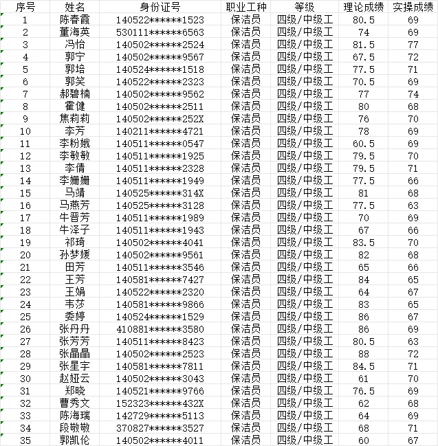 晉城市潔霸清潔服務(wù)股份有限公司職業(yè)技能等級認定中心現(xiàn)將2024年1月20日認定人員成績公示如下: