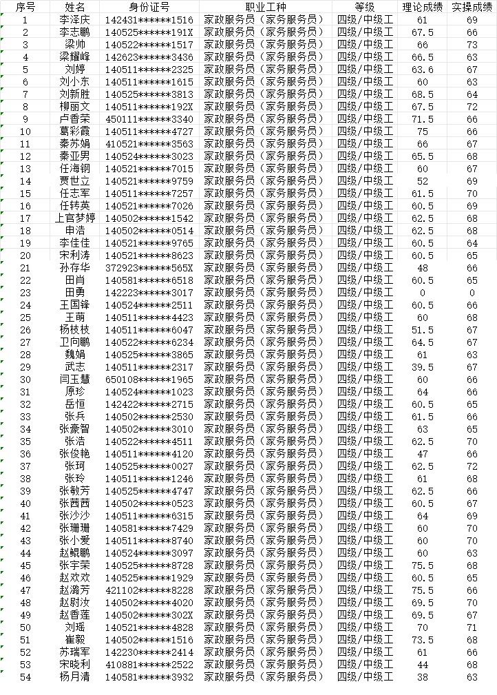 晉城市潔霸清潔服務(wù)股份有限公司職業(yè)技能等級認(rèn)定中心現(xiàn)將2024年1月21日認(rèn)定人員成績公示如下: