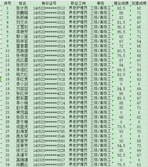 晉城市潔霸清潔服務(wù)股份有限公司職業(yè)技能等級認定中心2024年5月20日下午第14批養(yǎng)老護理員高級認定人員成績公示