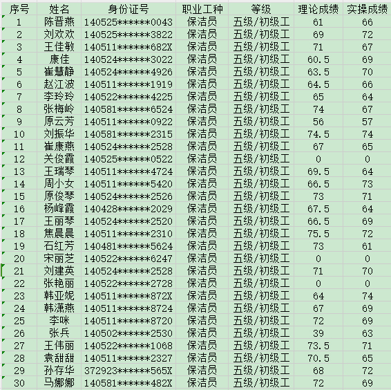 2024年8月18日第30批保潔員初級(jí)認(rèn)定人員成績(jī)公示