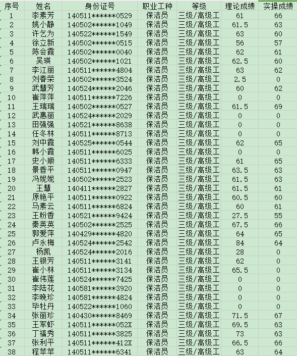 晉城市潔霸清潔服務股份有限公司職業(yè)技能等級認定中心現將2024年9月1日認定人員成績公示如下: